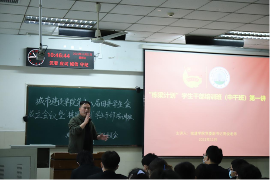 (通讯员 刘悦/文 张剑琳/摄)青春当奋斗,矢志作栋梁。11月21日上午10时许,城建学院第十八届团委学生会成立会议暨“栋梁计划”学生干部培训班第一讲活动在东校区12教102教室举行。院党委副书记周俊老师、院团委副书记何儒权老师,校学生会执行主席庄功伟,第十七届院学生会执行主席李英杰,以及第十八届团委及学生会全体成员,研究生会成员参加活动。活动由院团委组织部主要负责人董静怡主持。