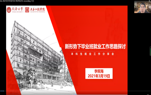 会上,李照海以“新形势下毕业班就业工作思路探讨”为题,阐述了常态化疫情防控、经济放缓下行压力增加以及研究生扩招等形式之新,介绍了同济大学土木工程学院在应对新形势下就业工作挑战方面的创新举措,最终结合我院实际给出了相关建议。针对考研学生扎堆报名校、落榜后也不积极调剂或是选择就业等情况,他讲到要注重一对一的具体引导,通过收集历年考研“二战”上岸数据、以实例强调应届毕业生身份的重要性等,引导学生做多手准备;针对学生就业积极性不高、慢就业缓就业甚至不就业情况,他建议利用朋辈和校友引导,选树优秀典型,通过打造成功就业案例营造积极就业的氛围,形成正面反馈。