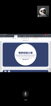 接下来,城建学院两位2020年考研优秀学子分别向同学们分享了个人考研经验。考取华中科技大学的建筑11501班王秀颖同学,从时间规划、科目备考、学习技巧及日常生活等方面详细讲述了自己近一年的考研历程。考取湖南大学的给排水11601班胡墨浓同学,结合自身实际情况,从选择学校和专业、考研规划和考研期间的心态,向学弟学妹们传授了自己成功的经验。