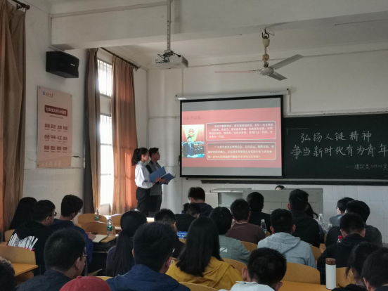 班会流程分为三项:学习人链精神,开展生命教育及感恩教育。班会开始,大家首先观看了“10•24”事件回顾视频,视频中详细展现了“10•24”事件的前因后果以及在这次事件中牺牲的陈及时、何东旭、方招三个人的生平事迹,不少同学在观看视频时,热泪盈眶、泣不成声。随后由庄功伟深情朗诵了短诗《给你我的手》,将同学们的情绪进一步引向深入。该班团支部自己制作的参观10·24纪念馆视频让现场同学重温了参观纪念馆时的感动与自豪。紧接着又列举了我校近年来的救助他人的事例,展现出来了“人链”精神的传承,后继有人,而身为大一新生的我们更应当传承和发扬人链精神。在生命教育专题中,重点介绍了一起参与救人的冬游队成员,他们是自发群众组织。自2003年成立以来,冬泳队就以舍己救人为宗旨,自觉践行自己的诺言,据统计,冬泳队成立至今,队员们在长江中一共救了100多人……随后主持人进行了互动抢答环节,设置了一些基本的安全常识问题,同学们积极抢答,置身其中。在感恩教育环节,主持人用过去世世代代为英雄袁崇焕守墓的佘家义家族;为金训华烈士守墓37年的陈健;以及无论生活多艰苦都不放弃养母的孟佩杰三个具体的事例展现了感恩是力量之源,爱心之根,勇气之本。