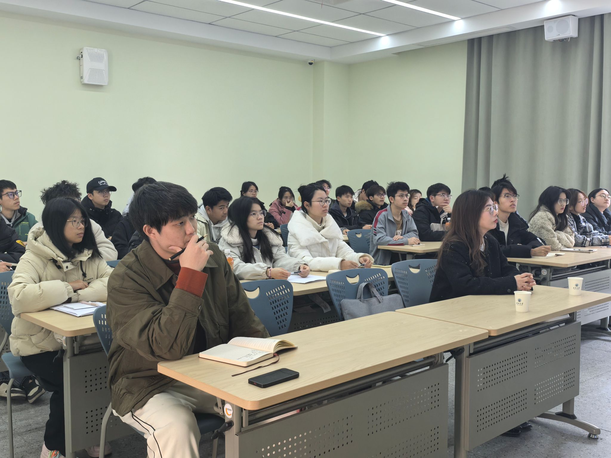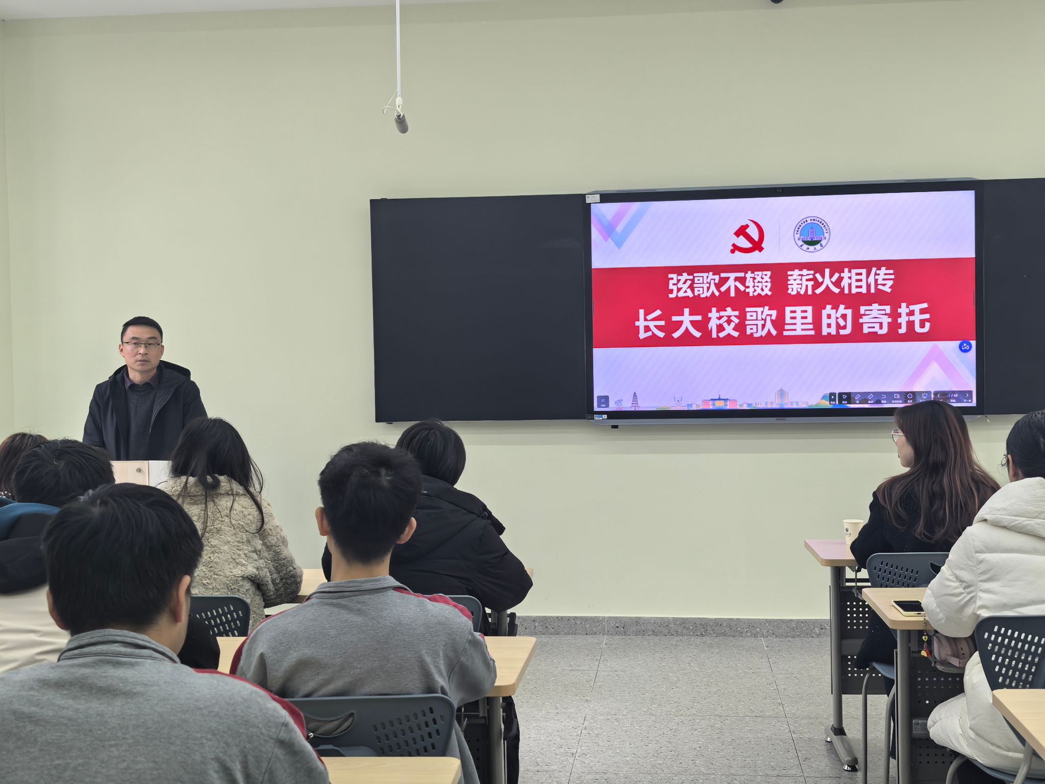 课堂上,吕一兵以校歌发展脉络为线索,从历史维度切入,生动还原校歌从雏形到定型的创作历程,结合时代背景解读校歌诞生的深层意义。他聚焦歌词解析与内涵品读,紧扣“一代人有一代人的长征与担当”的时代命题,将校歌中的治学态度、奋斗精神与家国情怀,转化为可感可知的思政教育素材,引导学生从校歌文化中汲取精神养分。吕一兵强调,校歌是学校精神的“活化石”,更是思政教育的重要载体,希望同学们以校歌为指引,在专业学习中锤炼本领,在成长实践中勇担使命,让校歌精神成为青春远航的不竭动力。