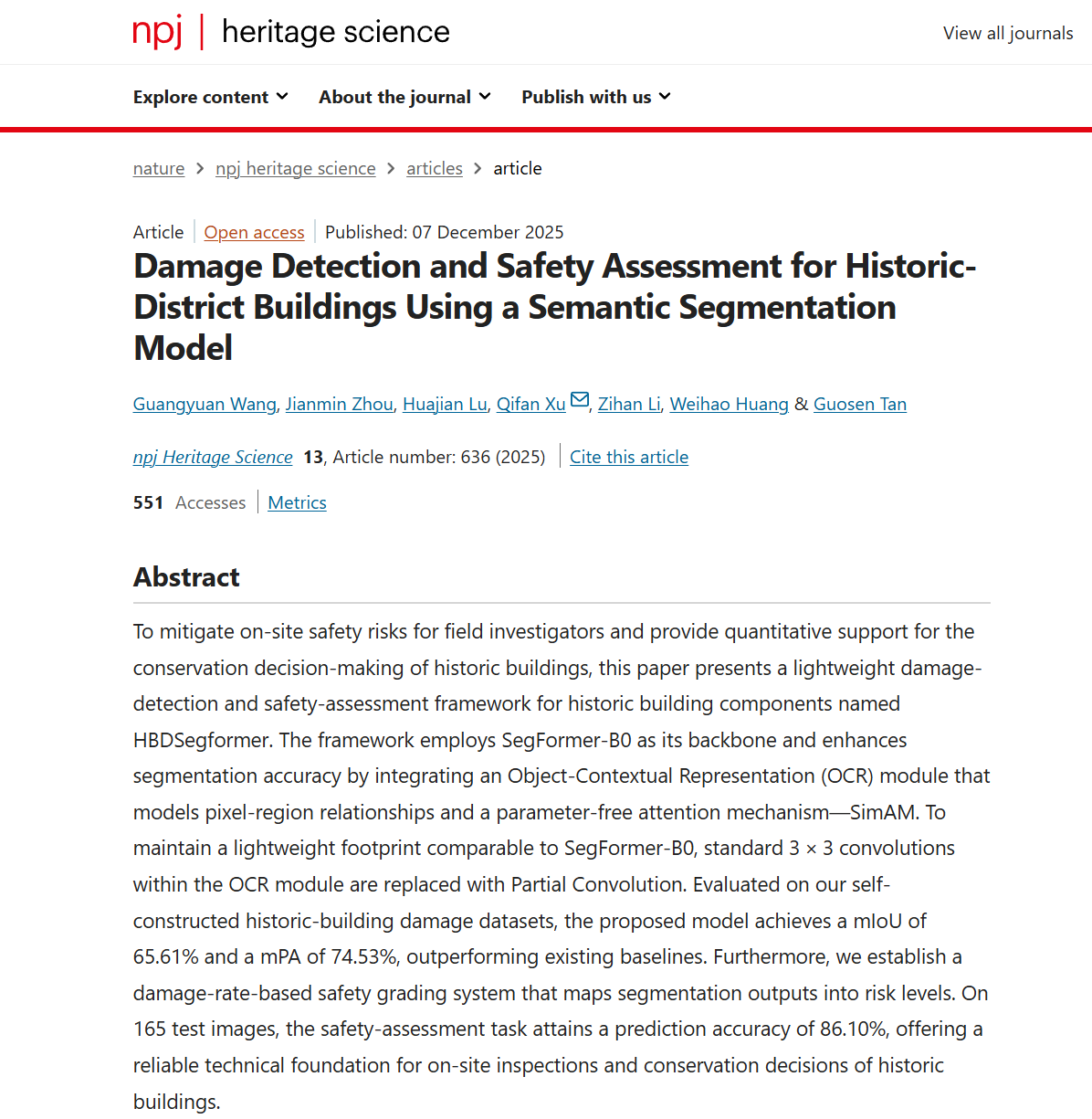 (通讯员 王广源)近日,我院硕士研究生王广源在文化遗产国际顶级期刊《npj Heritage Science》发表题为“ Damage Detection and Safety Assessment for Historic-District Buildings Using a Semantic Segmentation Model ” 的论文。npj Heritage Science 前身为 Heritage Science(《遗产科学》),创刊于2013年,是文化遗产研究与保护领域具有重要国际影响力的英文学术期刊,为中科院一区top期刊,被A&HCI(Arts and Humanities Citation Index)和SCIE(Science Citation Index Expanded)收录。自2025年1月1日起,npj Heritage Science正式加入Nature系列期刊。