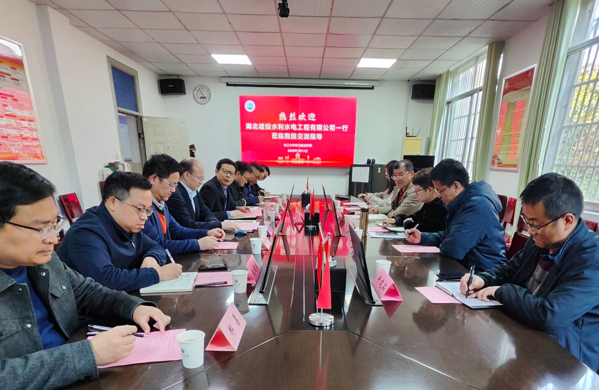 (通讯员 蔡威威)3月13日上午,湖北建投水利水电工程有限公司一行5人来访,双方就深化校企合作、推动产教融合等事宜开展座谈交流。本次到访学院的有湖北省路桥集团科学技术质量部部长黄锦、科学技术质量部经理程树范,水利公司总工程师张永军、工程技术部部长牛建品、工程技术部经理陈斯。我院院长肖桃李、副院长黄向阳、院长助理赵云峰及杨学祥教授、武超毅教授等参加座谈。会议由副院长黄向阳主持。