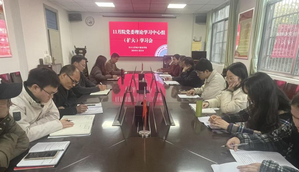 11月25日下午,学院党委理论学习中心组在9教208会议室召开中心组(扩大)学习会,开展11月份政治理论学习,同时传达学习习近平总书记考察湖北重要讲话精神。学院全体领导班子、学院党委委员、党支部书记、系主任和科室负责人参加会议,会议由学院党委书记谌姿主持。