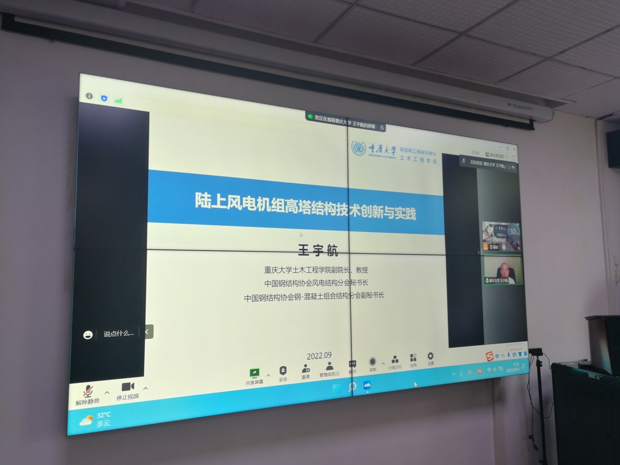 9月16日下午,我院在9教208会议室举行了2022年长江城建讲坛第十八讲的学术讲座。重庆大学土木工程学院副院长,博士生导师,中国钢结构协会风电结构分会秘书长、钢-混凝土组合结构分会副秘书长,重庆市青年专家工作室首席专家,《建筑科学与工程学报》编委,以及霍英东青年教师基金、国家优秀青年科学基金获得者王宇航教授做客讲坛,并为学院师生作了题为“陆上风电机组高塔结构技术创新与实践”的学术讲座,学院多位教师和研究生参加了活动。