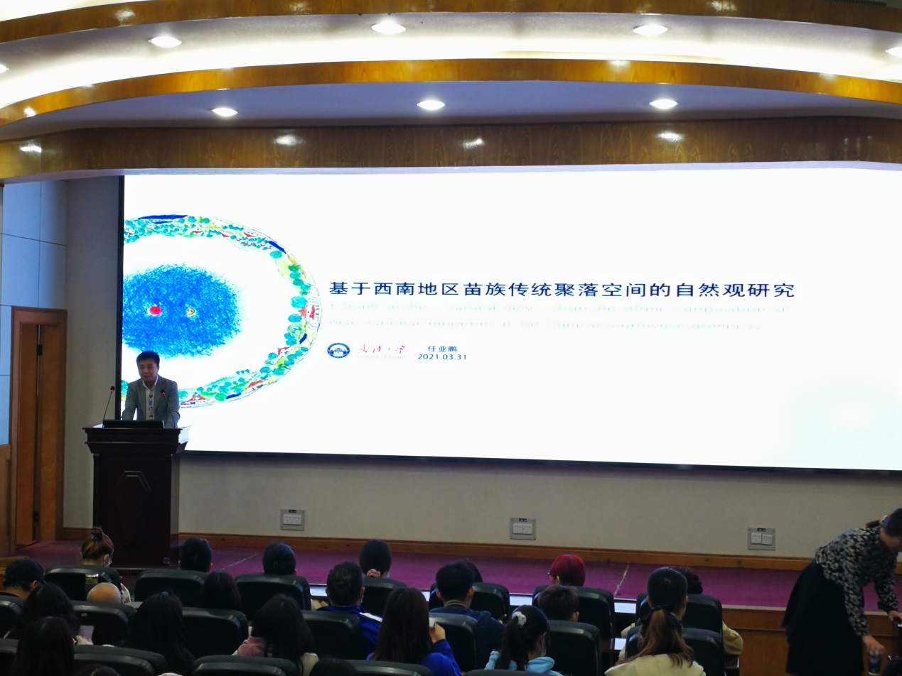 讲座中,任亚鹏副研究员以发源于中国,有着悠久历史,世界分布广泛的苗族传统聚落为研究对象,从民俗文化,择地环境,住宅建筑等方面着眼,向到场师生介绍了对西南地区苗族传统聚落空间自然营造的相关研究。