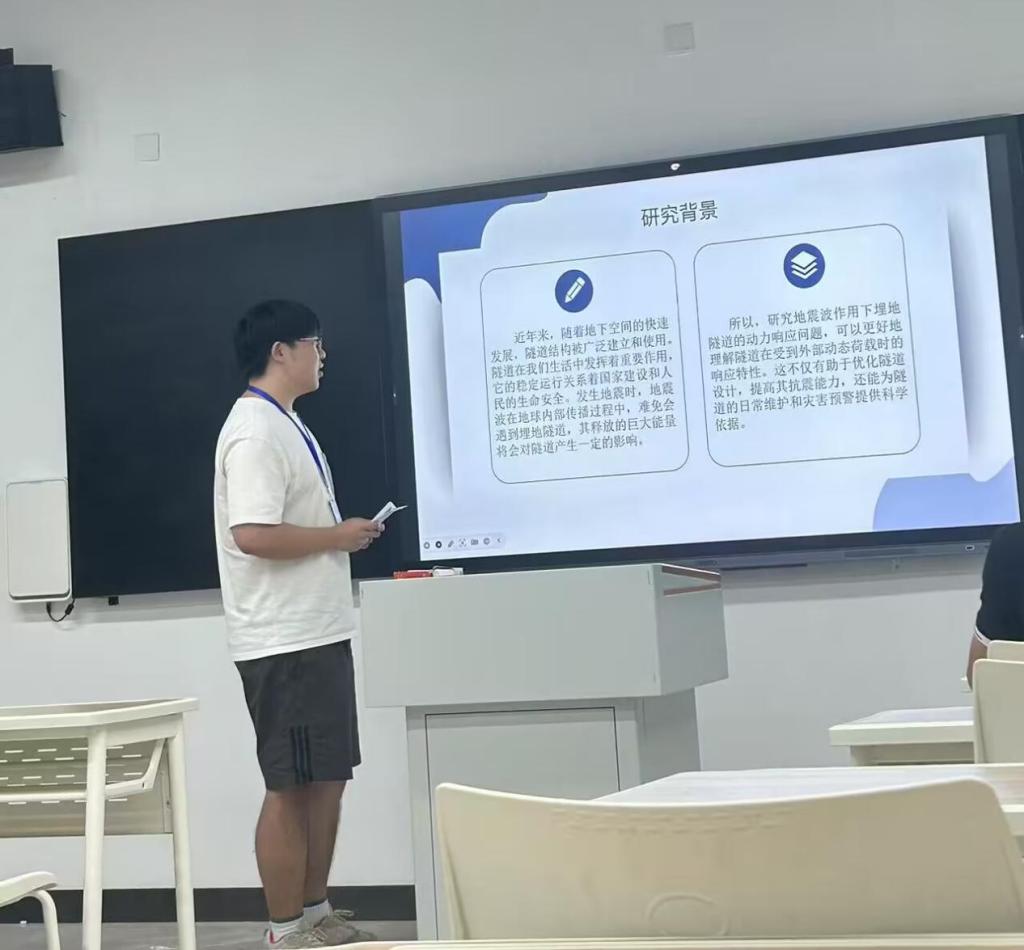我院2023级研究生孙睿哲在论坛中以“SV波和P波作用下隧道动力响应特征研究”为主题进行了汇报,内容主要聚焦于结合 FLAC3D 与 MATLAB 软件,研究地震波斜入射下隧道动应力响应的分析方法。通过理论软件结合揭示不同地震动参数下SV波和P波的传播规律及其对地下隧道的动力响应机制,旨在准确评估地震荷载对隧道结构的损伤效应,同时为提升城市地下空间抗震能力提供理论支撑与技术参考。