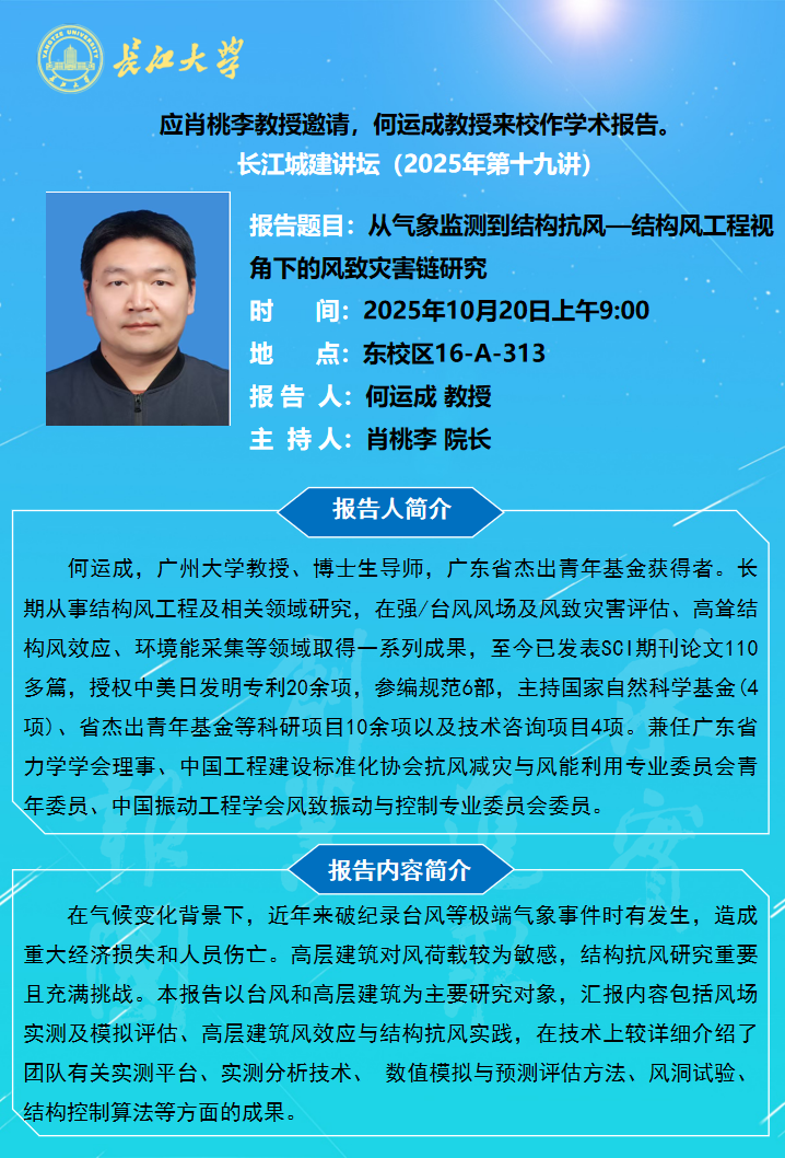 长江城建讲坛2025年第十九讲:从气象监测到结构抗风——结构风工程视角下的风致灾害链研究