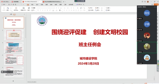 (通讯员 郭博雅)为加强学风建设,稳步推进本科教育教学审核评估工作,助力建设文明校园,2024年3月28日,yl9193永利集团于线上召开“围绕迎评促建,创建文明校园”班主任例会,分管教学副院长黄向阳、院党委副书记周洁如、全体辅导员、班主任参会,会议由院学工办主任魏民生主持。