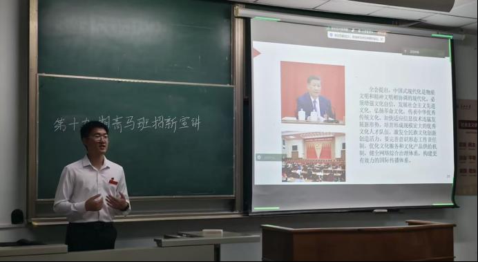 (通讯员 刘倞)“青春建功新时代,我与青马共成长”。10月11日晚七点,我校第十七期青马班宣讲团成员受邀请,采用线上线下相结合的方式,于13教C119教室为我院23级学生代表带来了一场精彩的宣讲。