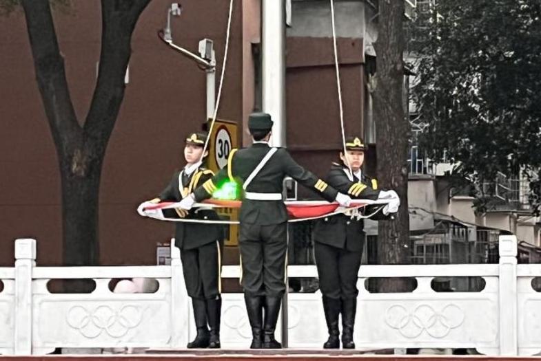 仪式开始,在全体师生的注目下,国旗护卫队迈着整齐有力的步伐护送国旗入场。随后,庄严的《义勇军进行曲》奏响,五星红旗缓缓升起,在晨风中高高飘扬。全体师生怀着对祖国无限的热爱与崇高的敬意,向国旗行注目礼。