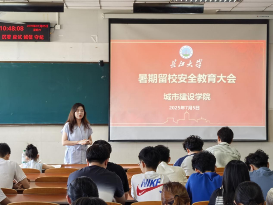 (通讯员 魏民生)7月5日上午,城建学院在东校区12教204召开暑期留校学生安全教育大会,学院党委副书记周洁如、2022级辅导员杜琛及暑期留校本科生、研究生参加会议。会议由学工办主任魏民生主持。
