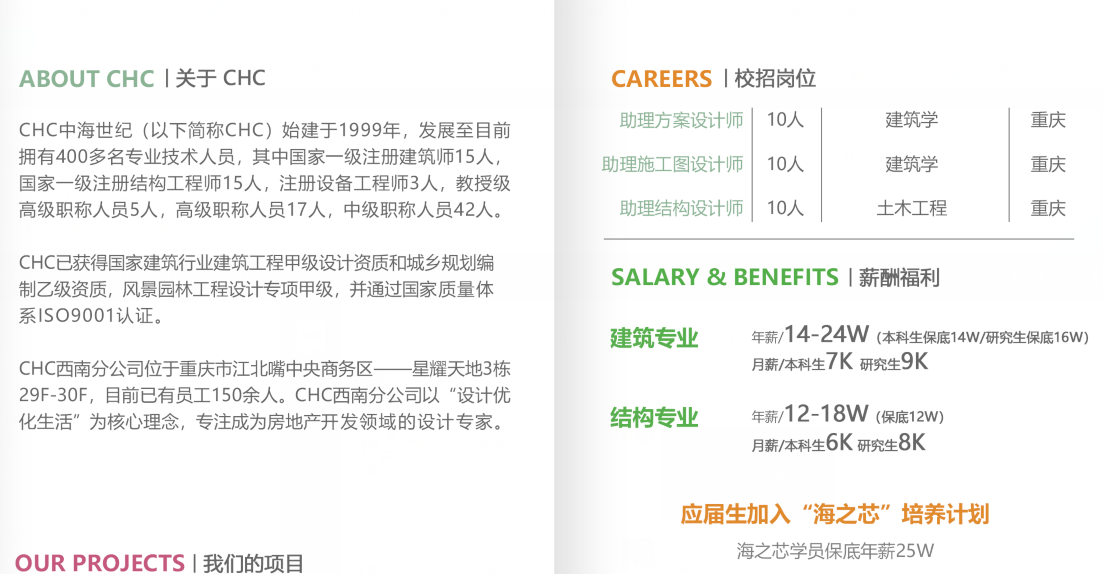 建筑学(10人)本科生月薪7000起研究生月薪9000起年薪保底14—16W签入合同土木工程(5人)本科生月薪6000起研究生月薪8000起年薪保底12W签入合同员工福利:五险一金;带薪年假;中晚两餐;第一年提供单间宿舍;报销入职机票简历投递邮箱:536514980@qq.com联系人:罗女士联系电话/微信:13983775043