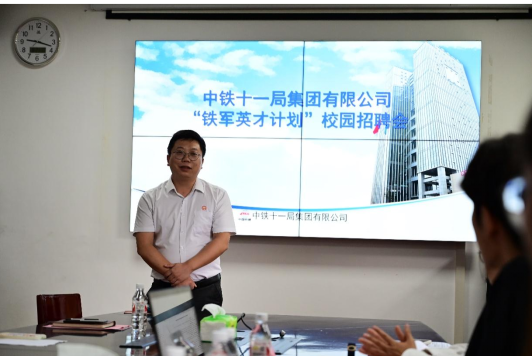 会议现场,蔡枫主任向在座学生深入讲解中铁十一局“铁军英才计划”校园招聘政策。众多学生现场投递简历,并与企业代表进行了详细咨询。