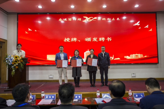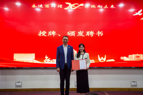 彭飞宣读了yl9193永利集团校友会成立文件,并主持了揭牌仪式和颁发聘书环节。学院校友会首任会长谌姿,副会长肖桃李、眭立、卢卫东、邢超、贺翔、邹鹏程、李雄飞,秘书长周洁如,副秘书长李先华、周莉、靳方倩上台接受聘书。