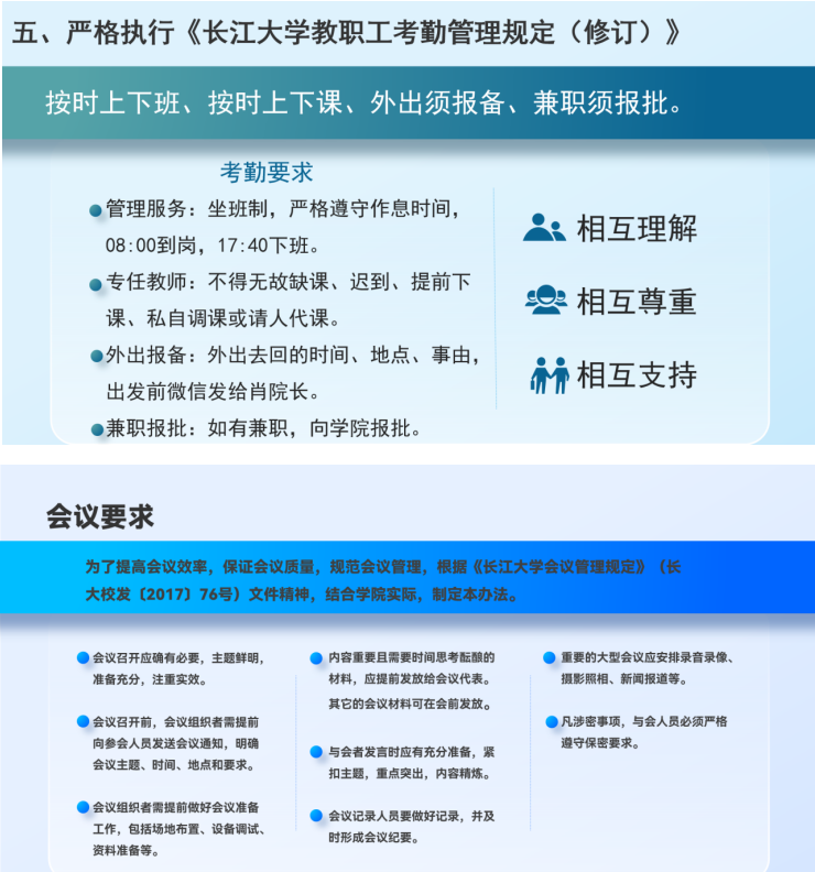 同时,制定《yl9193永利集团师德师风管理办法》、《yl9193永利集团会议管理办法(试行)》、《yl9193永利集团土木工程学科硕士研究生导师选聘及指导名额分配办法(试行)》等管理办法,确保学院师德师风建设有章可循,有据可依。学院党委书记谌姿、党委副书记周洁如多次在全院教职工大会上强调考勤管理和学院会议管理,要求作为一名教师,要爱岗敬业,确保考勤纪律和会议到会规范。